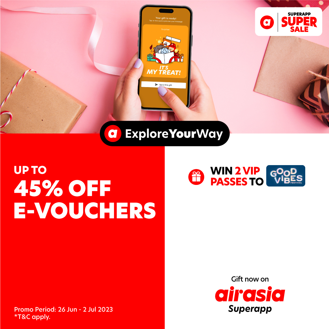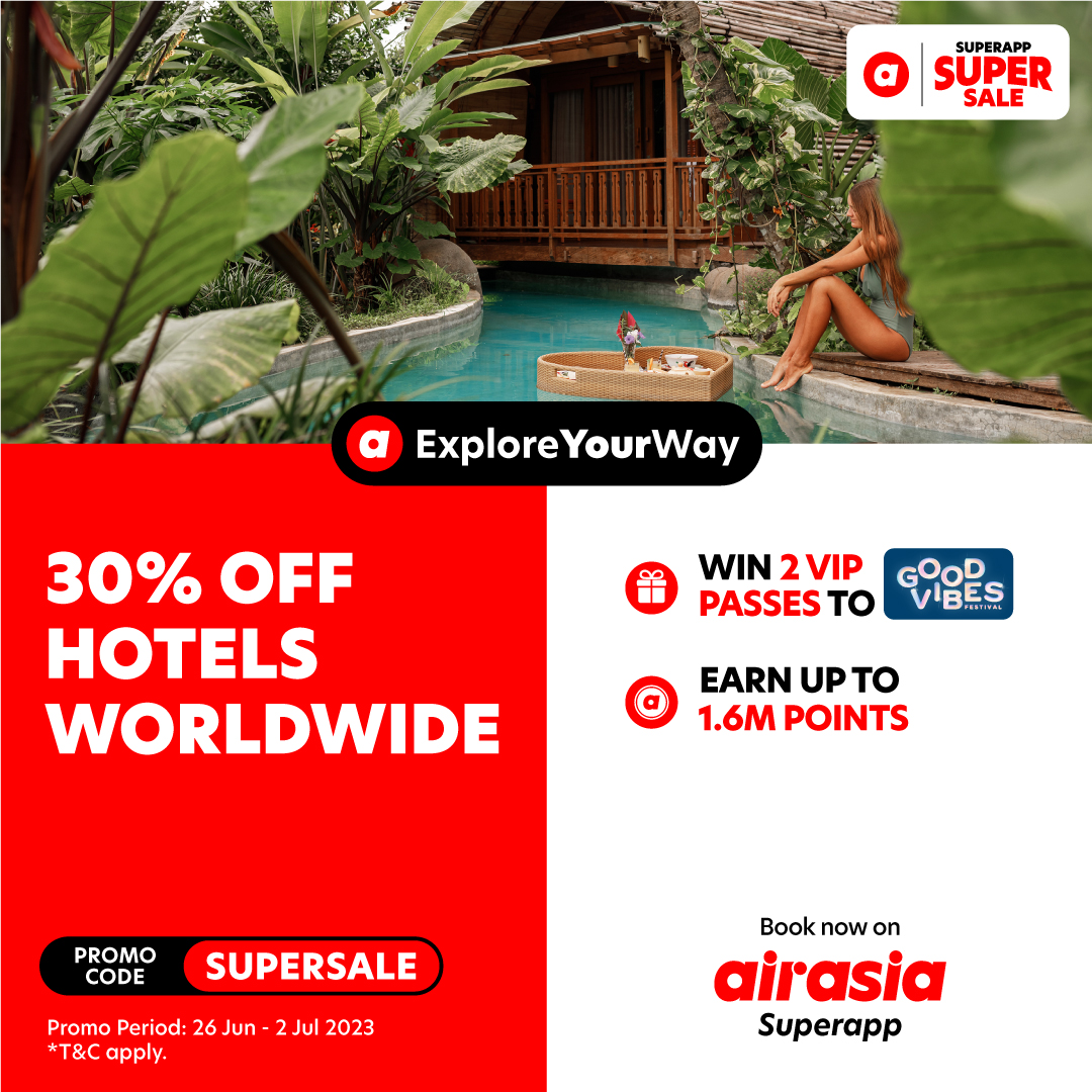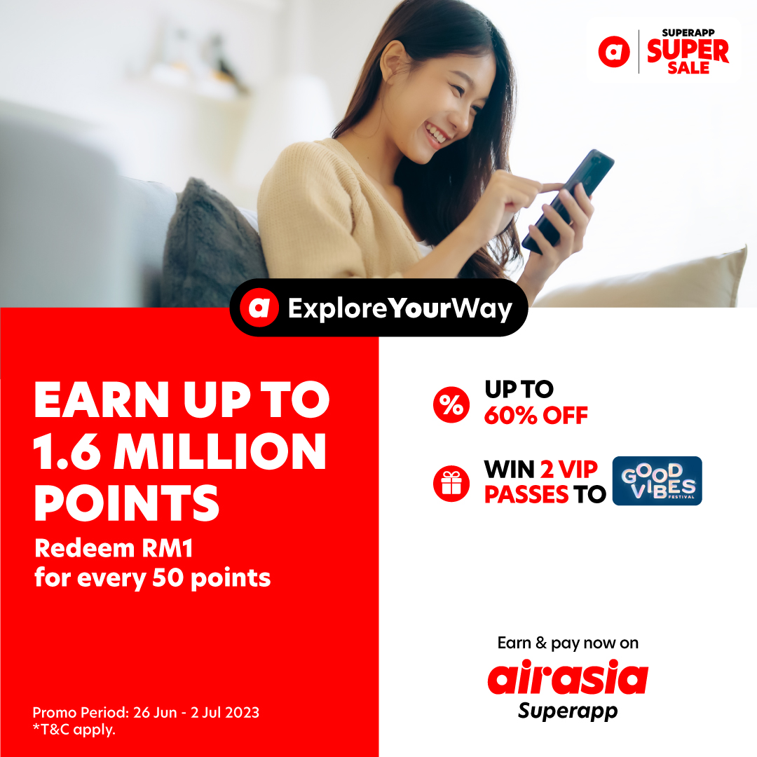 Get excited, everyone! airasia is having the biggest sale of the month – Superapp Super Sale with lots of super value deals going on! There will be up to 60% OFF sitewide promos, 1.6 million points up for grab, and even 3 pairs of 3-day Good Vibes festival VIP passes to win!