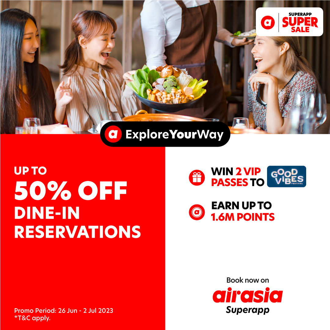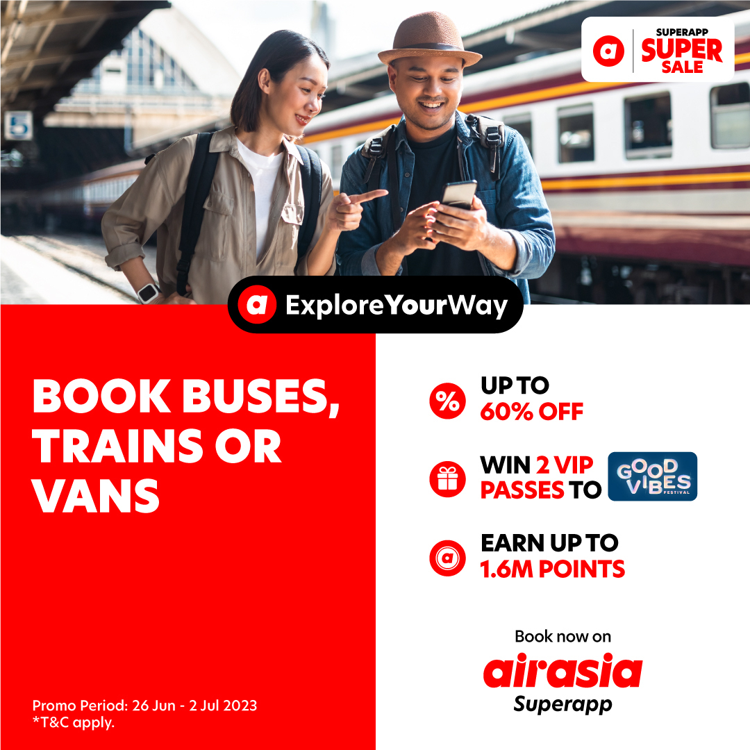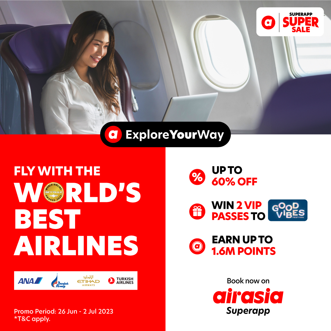 Get excited, everyone! airasia is having the biggest sale of the month – Superapp Super Sale with lots of super value deals going on! There will be up to 60% OFF sitewide promos, 1.6 million points up for grab, and even 3 pairs of 3-day Good Vibes festival VIP passes to win!