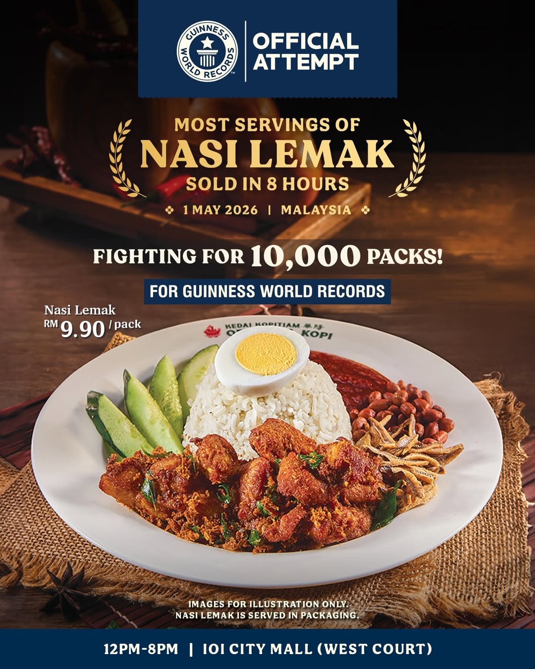 The record attempt will be held strictly at IOI City Mall, Putrajaya, and will not be available at any other Oriental Kopi outlets nationwide. All nasi lemak will be served in takeaway packaging for efficiency during the challenge, and the entire process will follow official Guinness World Records guidelines, including proper counting, documentation, and independent verification to ensure credibility.